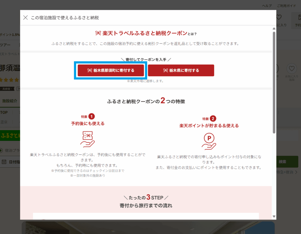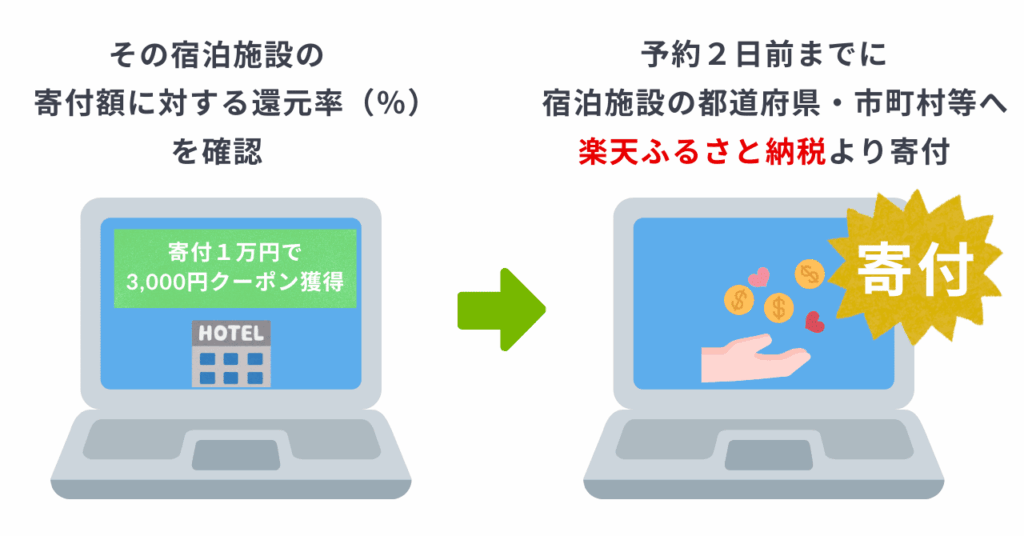 ※楽天トラベル予約時にクーポンが利用出来るのは、寄付した都道府県・市町村にある宿泊施設に限ります。