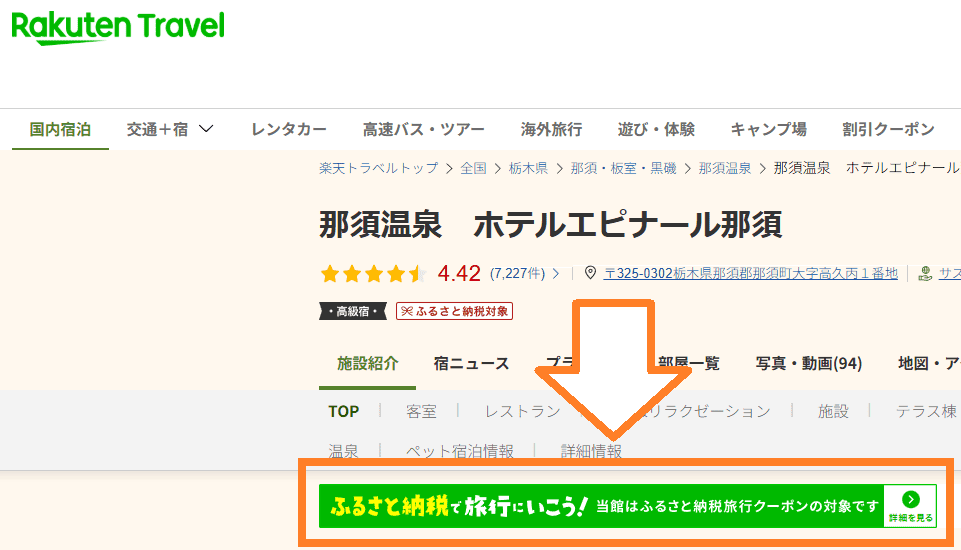 楽天トラベルにある泊まりたい宿泊施設が、楽天ふるさと納税で何%還元されるか確認する方法